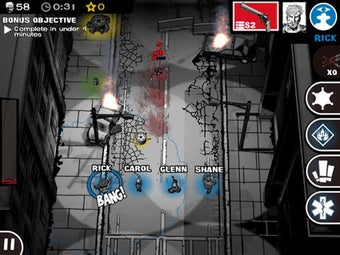 El objetivo de cada nivel de The Walking Dead: Assault es sencillo: elimina a todos los caminantes y sobrevive. Empezarás únicamente controlando a Rick, pero a medida que avances podrás reclutar a nuevos supervivientes y crear tu pequeño grupo de ataque. Entre ellos están los más emblemáticos personajes del comic como Shane, Glenn, Lori, Andrea, Dale, etc.